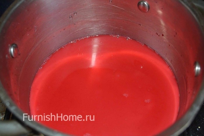 В воду насыпала крахмал и тщательно перемешала – эту смесь потихонечку влила в кастрюлю с соком, всё время перемешивая.