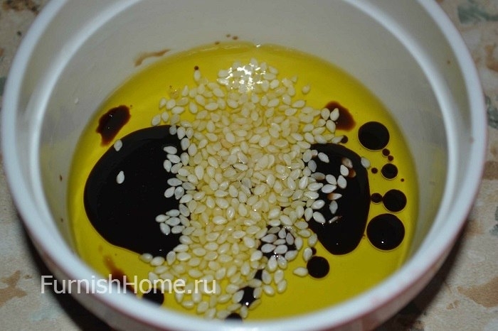Для заправки салата соединяем оливковое масло с бальзамическим уксусом, солью и кунжутными семечками. Добавляем заправку в салат и все тщательно перемешиваем.