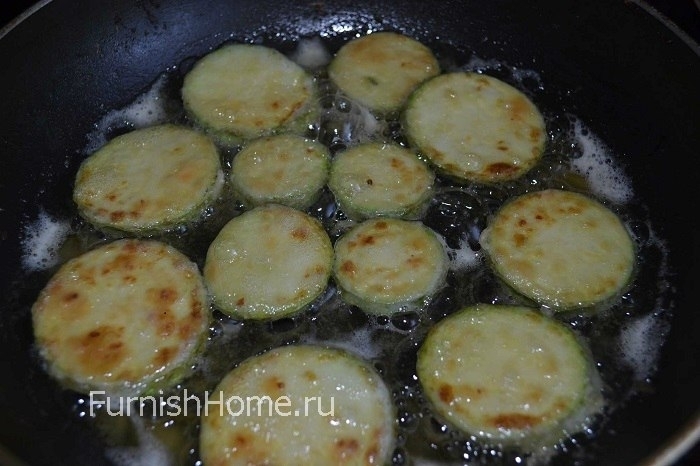 На разогретую с маслом сковороду выкладываем запанированные в муке колечки кабачков и обжариваем их с обеих сторон. Выкладываем на блюдо и дожидаемся, пока они остынут.