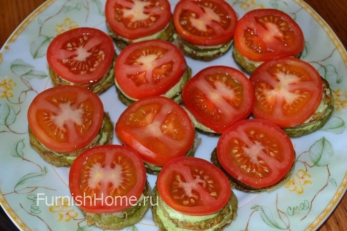 Осталось лишь порезать помидоры колечками и можно приступать к формированию закуски.