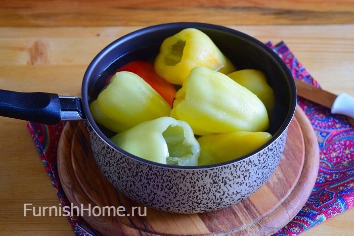 Полученные овощные ёмкости опустим в кипящую воду на 5-7 минут. В результате термической обработки они заметно размягчатся.
