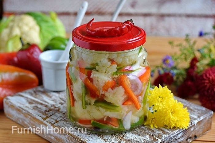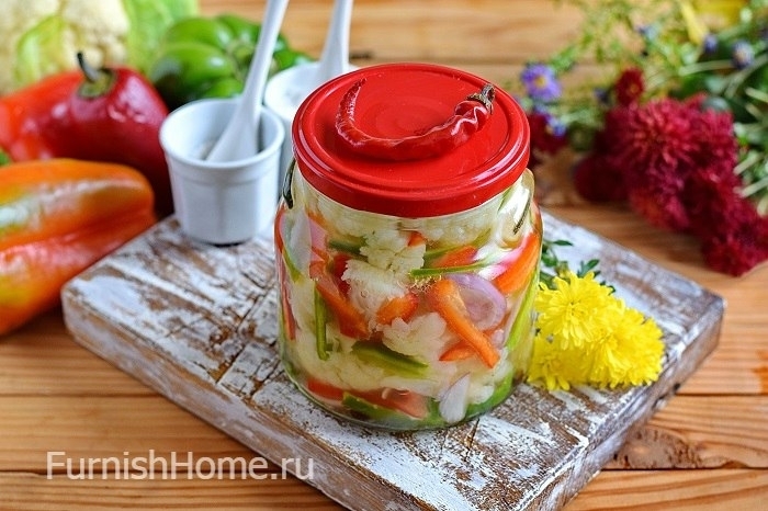 Предлагаем запастись интересной заготовкой на зиму - салат из цветной капусты. Диетические качества и вкус которой достойны высшей похвалы. Она намного лучше усваивается организмом, чем все другие виды капусты. Дополнительными ингредиентами салата будет перец и репчатый лук, они превосходно дополнят вкус капусты. Обязательным приложением к овощному миксу станет маринад.