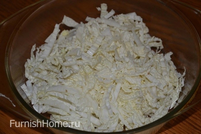 Для начала мелко-мелко нашинкуем пекинскую капусту.
