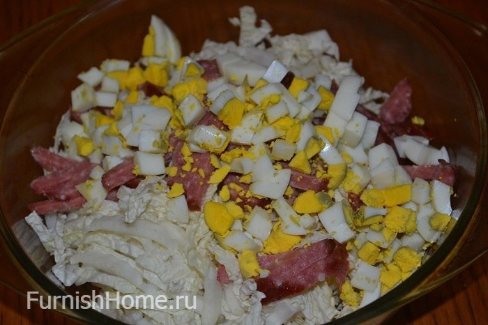 Затем соломкой порежем салями и тоже отправим в салатник.