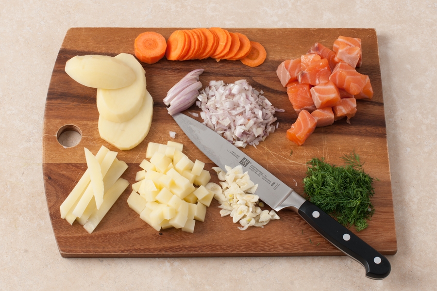 Лук нарежьте мелким кубиком, картошку — средним, морковь — кружочком, рыбу — кубиком 1,5х1,5 см, чеснок и укроп — мелко.