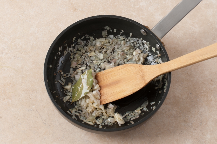 Обжарьте лук и половину чеснока с лавровым листом на умеренном огне на оливковом масле в течение 3-х минут до размягчения лука.