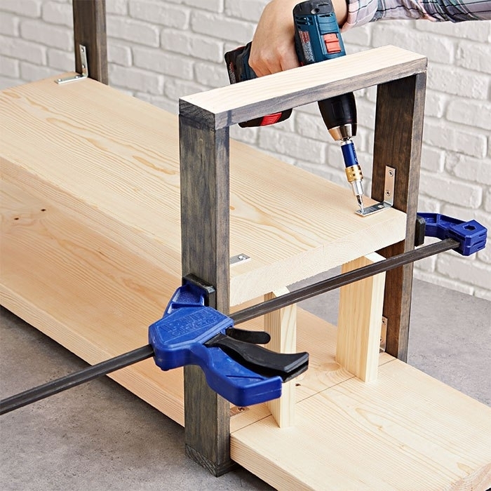 Из остатка доски вырежьте четыре распорки длиной 18 см. Поместите распорки на обратную сторону сидения внутри рамы-ножки и поместите на них полку (D) заподлицо с краями рамы-ножки. Приклейте полку к ножкам и зажмите. После того, как клей высохнет, уберите распорки и укрепите соединение 2-сантиметровыми отделочными гвоздями и угловыми 5-сантиметровыми скобами.