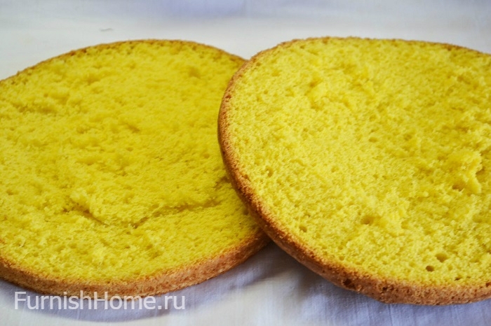 Все тщательно перемешать и разместить весь крем-прослойку на нижний корж бисквита. Сверху поместить второй корж, чуть придавить. Поставить бисквит в холодильник для того, чтобы прослойка застыла.
