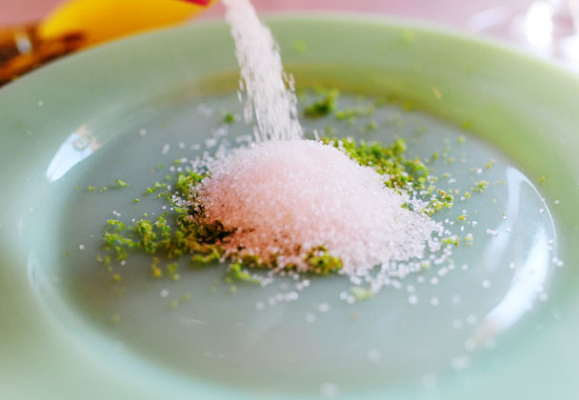 Натрите цедру лаймов. Если у вас есть время, дайте цедре немного подсохнуть, минут 10. Затем смешайте цедру с 2 столовыми ложками сахара. Смешивать лучше руками.