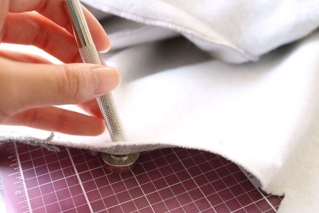 Если у вас нет дырокола для ткани, используйте для создания отверстий люверсы и перфоратор. Как это сделать, показано на трех фото ниже. Вам нужно просто поместить люверс с одной стороны, перфоратор с другой и затем ударить по нему несколько раз молотком. На российском рынке легче найти именно дырокол для ткани.