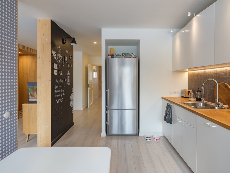 Благодаря смешению современного стиля и ретро получилось купить мебель в максимально доступных местах (ИКЕА, магазинчик WestElm, у бренда IDEA и диван в финском магазине BoConcept). Конечно же, такой ремонт по цене нельзя сравнить с тем, куда ставят белорусскую мебель и покупают декор в FixPrice, но это все-таки более доступно, чем «дизайнерский ремонт». В итоге ремонт может стоить на 50% дешевле благодаря ухищрениям, например, таким, как заказной стеллаж в гостиной, а не брендовый (владельцы просто обратились к местному мастеру), а также отказу от «классики евро-ремонта» — натяжных потолков, обоев, тяжеловесных молдингов и т. п.