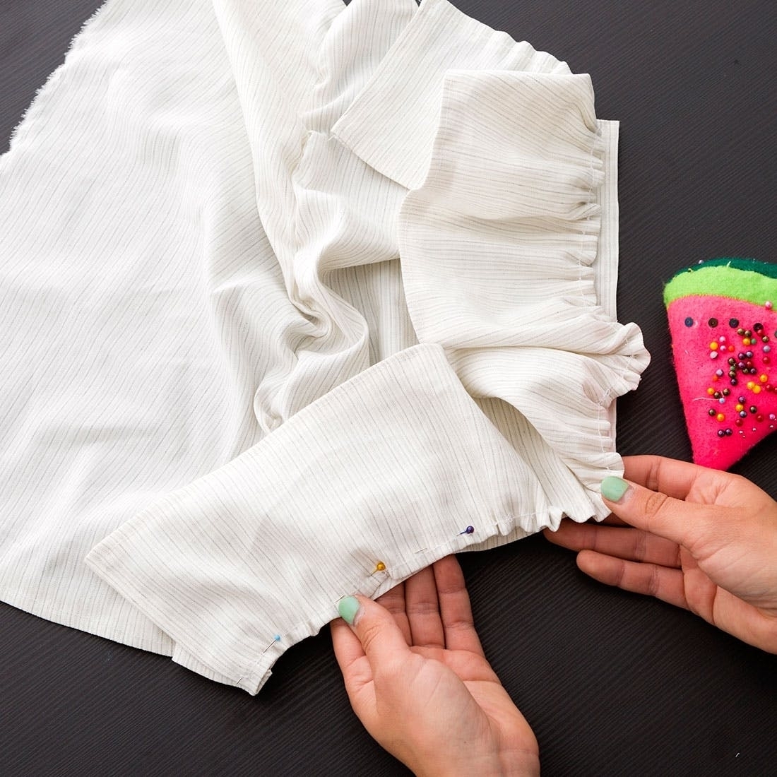 Оборку прикрепите булавками к верхнему краю выкройки топа. Прострочите на машине. Не прошивайте ровный шов, должны немного собираться складки.