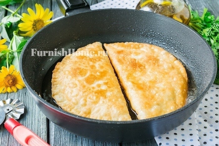 Будем обжаривать чебуреки из слоеного теста на среднем огне до золотистой корочки с двух сторон, чтобы начинка внутри полностью приготовилась.