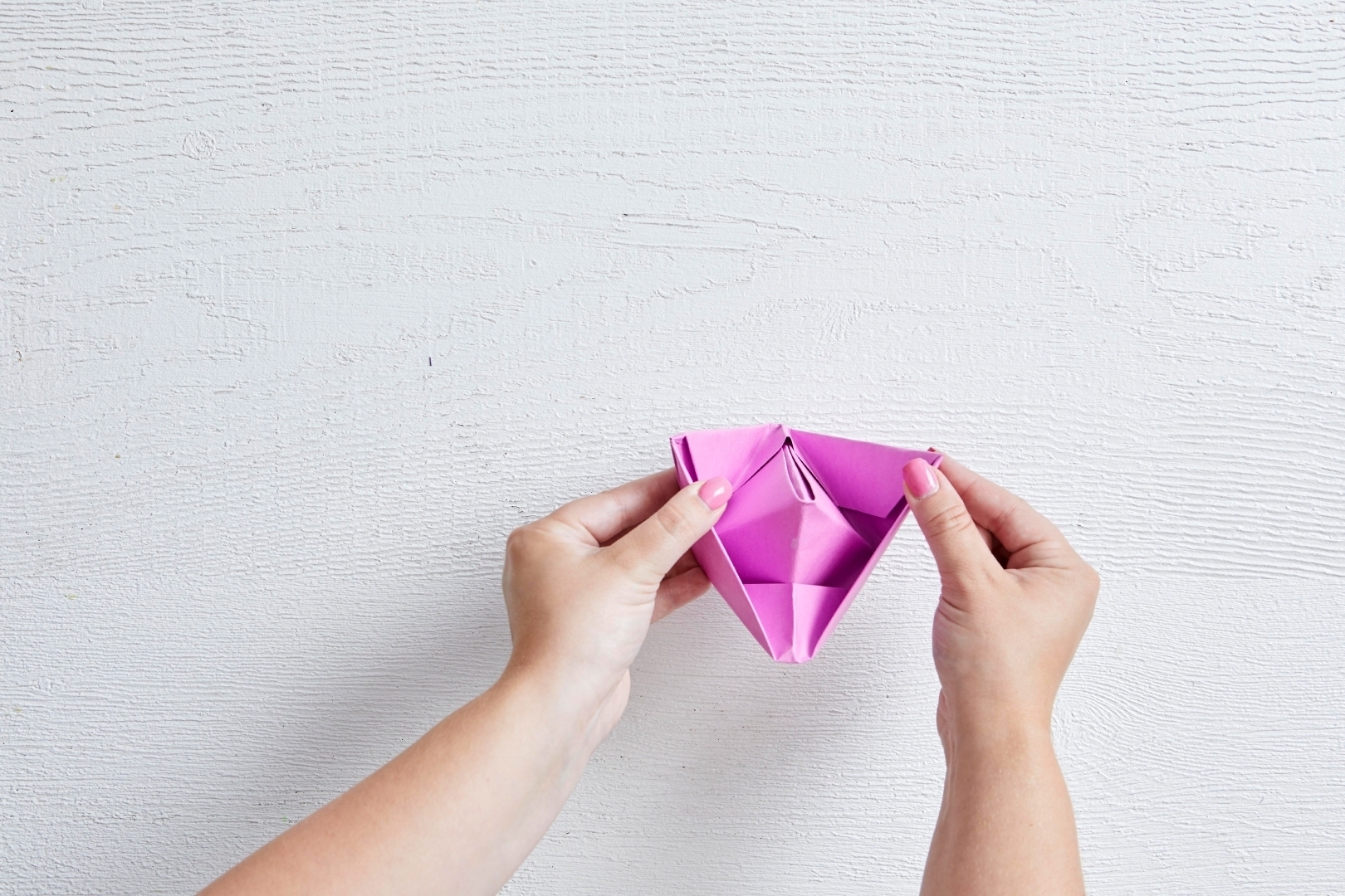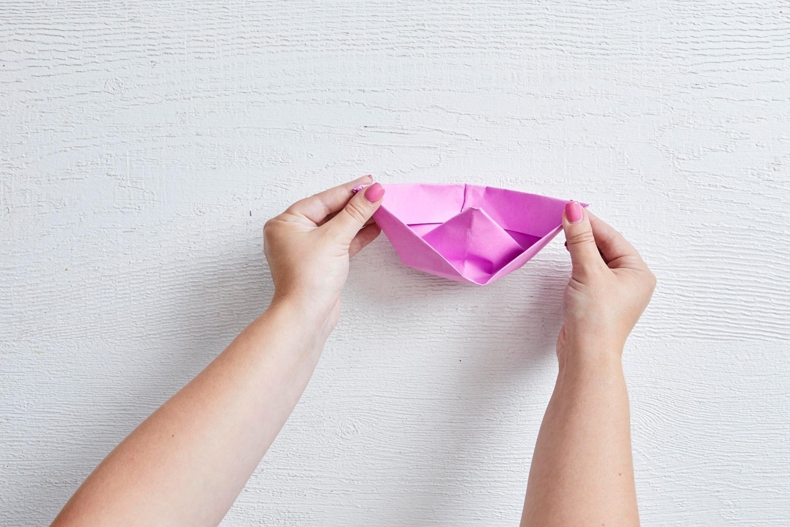 Осторожно раздвиньте края квадрата и отыщите треугольную верхушку. Ваше изделие должно напоминать лодку. Аккуратно распрямите изделие. Если при открывании бумага начнет разрываться, то обратно сложите изделие и тщательно согните все края, после этого действия бумажная лодка легче откроется.