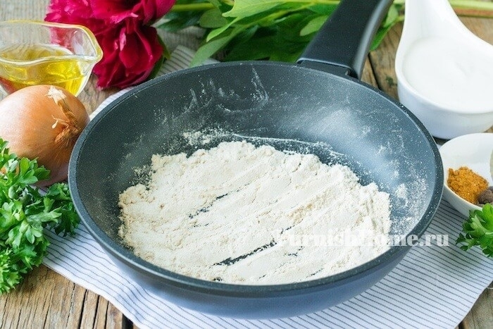 На отдельной сухой сковороде обжарим пшеничную муку до светло-коричневого оттенка.