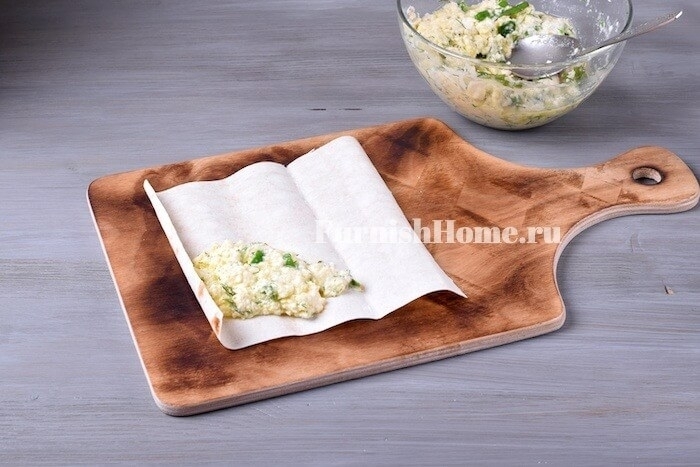 Возьмем один кусок лаваша и выложим на него 1-2 ст.л. начинки, располагая ее с одного края лаваша.
