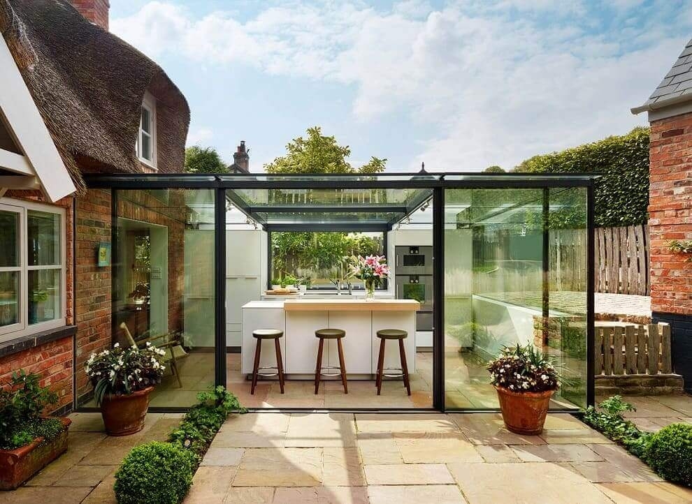 Обеденная зона с панорамными окнами. Отличный дачный вариант со стеклянной пристройкой.