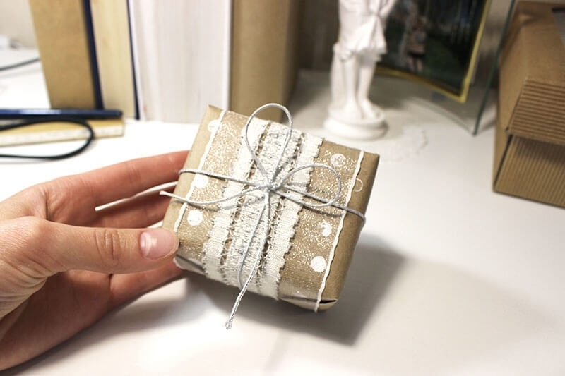 6. Подбираем любой красивый шнурок, обматываем вокруг бокса и завязываем на широкий бант.