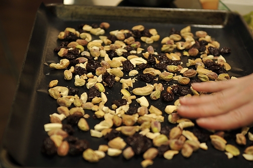 На противень на пергаментную бумагу в один слой выложить орешки, фисташки, перец чили и немного поджарить их в духовке.