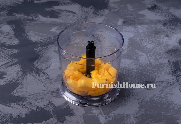 Мякоть манго, нарезанную на кубики, выкладываем в чашу блендера и пробиваем до состояния пюре. Полученное пюре протираем через сито, чтобы удалить волокна.