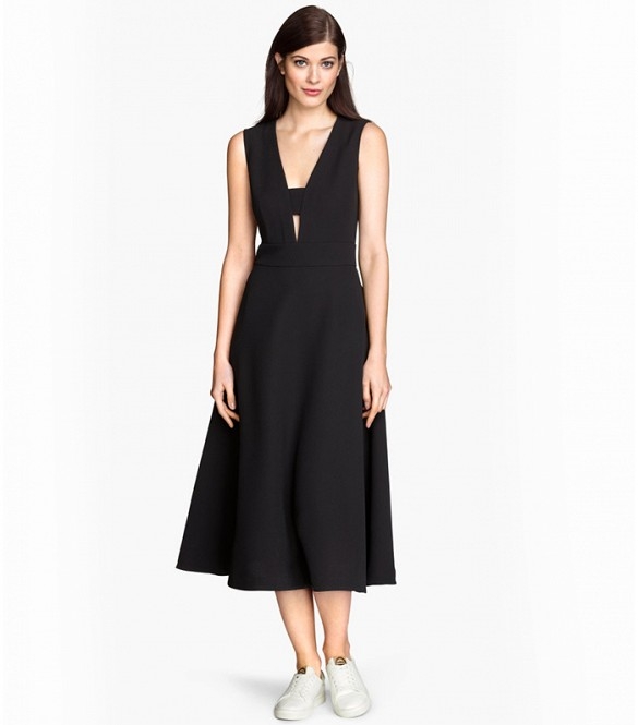 - платье с расклешенной юбкой от H&M Circle Skirt. Длинный покрой платья до икр позволит скрыть некоторые недостатки фигуры. Сексуальности образу придает широкое заниженное декольте. Также на платье имеются боковые карманы и потайная застежка.