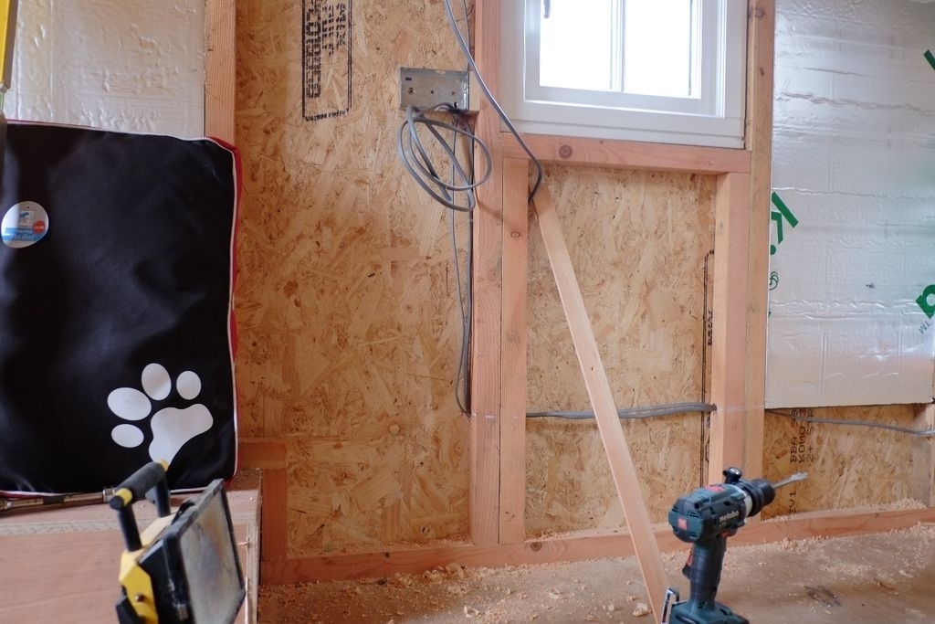Проводка прокладывается на высоте 300 мм от пола. В доме установлены 3 настенные лампы и 3 двойные розетки. Распределительный щит обеспечит безопасную подачу электроэнергии.