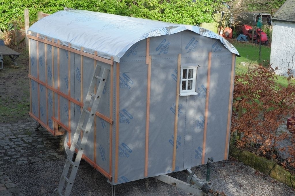 Идея конструкции этого деревянного дома на колесах навеяна традиционными пастушьими хижинами Англии, а в качестве основания использовано шасси старого фургона. Лесоматериалы хвойных пород (пихта) были куплены на местной лесопилке.