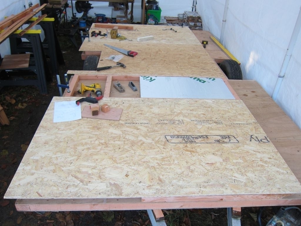Пол сделан из двух слоев строительной водонепроницаемой фанеры толщиной по 9мм с жесткой изоляцией 50 мм между брусками толщиной 75 х 50 мм. При строительстве дома использовались легкие и прочные доски из древесины дугласовой пихты. Все места стыков проклеены и прикручены. Конструкция должна получиться жесткой, легкой и прочной, чтобы выдерживать дорожную тряску.