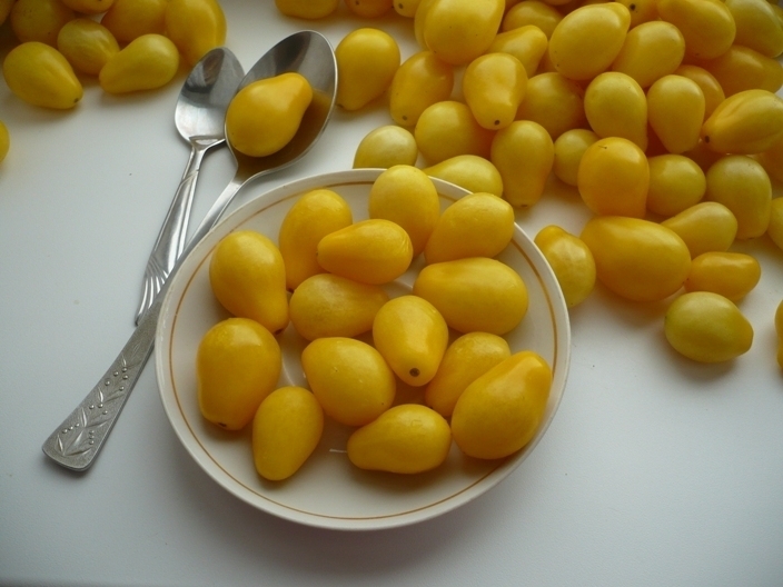 Этот сорт томатов можно вырастить только в теплице, в открытом грунте они не смогут дозреть. Данный вид довольно капризный, но тот урожай, который он дает перекрывает все потраченные усилия. Стебель томатов вырастает до полутора метра, потому его обязательно нужно подвязывать. Цвет плода — желтый, размеры томатов довольно мелкие, форма — грушевидная. Помидоры данного сорта можно и солить, и угощать ними гостей.